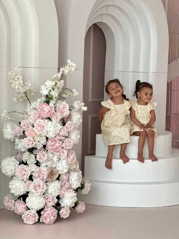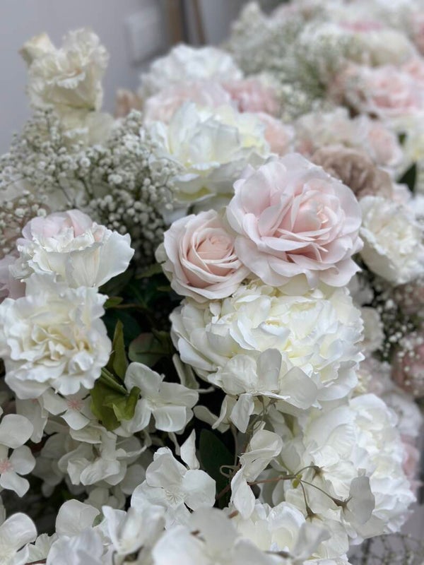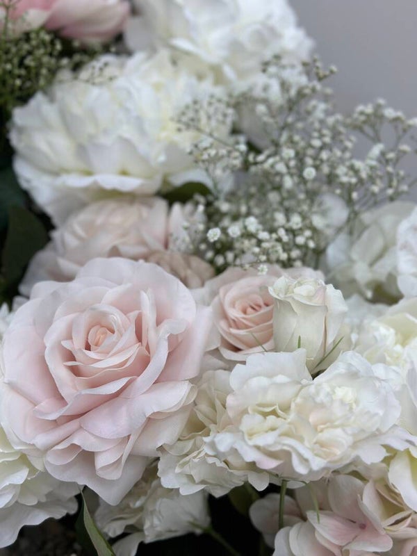 Prachtige kunstbloemen arrangementMet pioenrozen, rozen, hortensia's & gipskruid.