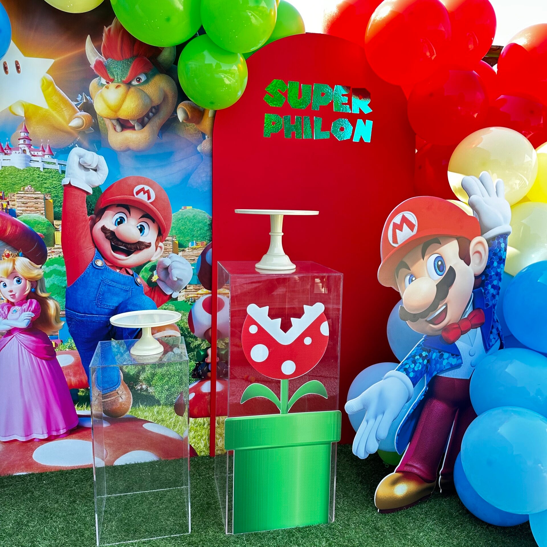 2x backdrop waarvan 1x print2x cutout1x XL ballonnendeco1x lichtcijfer2x zuilen incl taart plateaus1x naam op backdrop1x grasmat